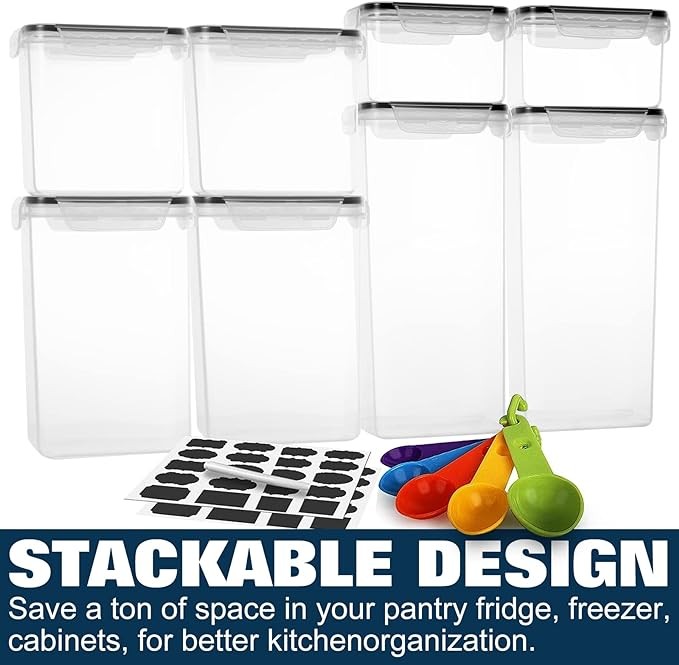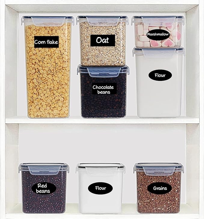 • VERSATILE USE: Perfect for storing spaghetti, baking supplies, cereal, flour, sugar, oats, pasta, rice, coffee, tea, snacks, nuts, fusilli, pet food and other dry goods. With 30 chalkboard labels and 5 measuring cups, allowing you to better organize your kitchen and pantry. Also a great gift for any family.
