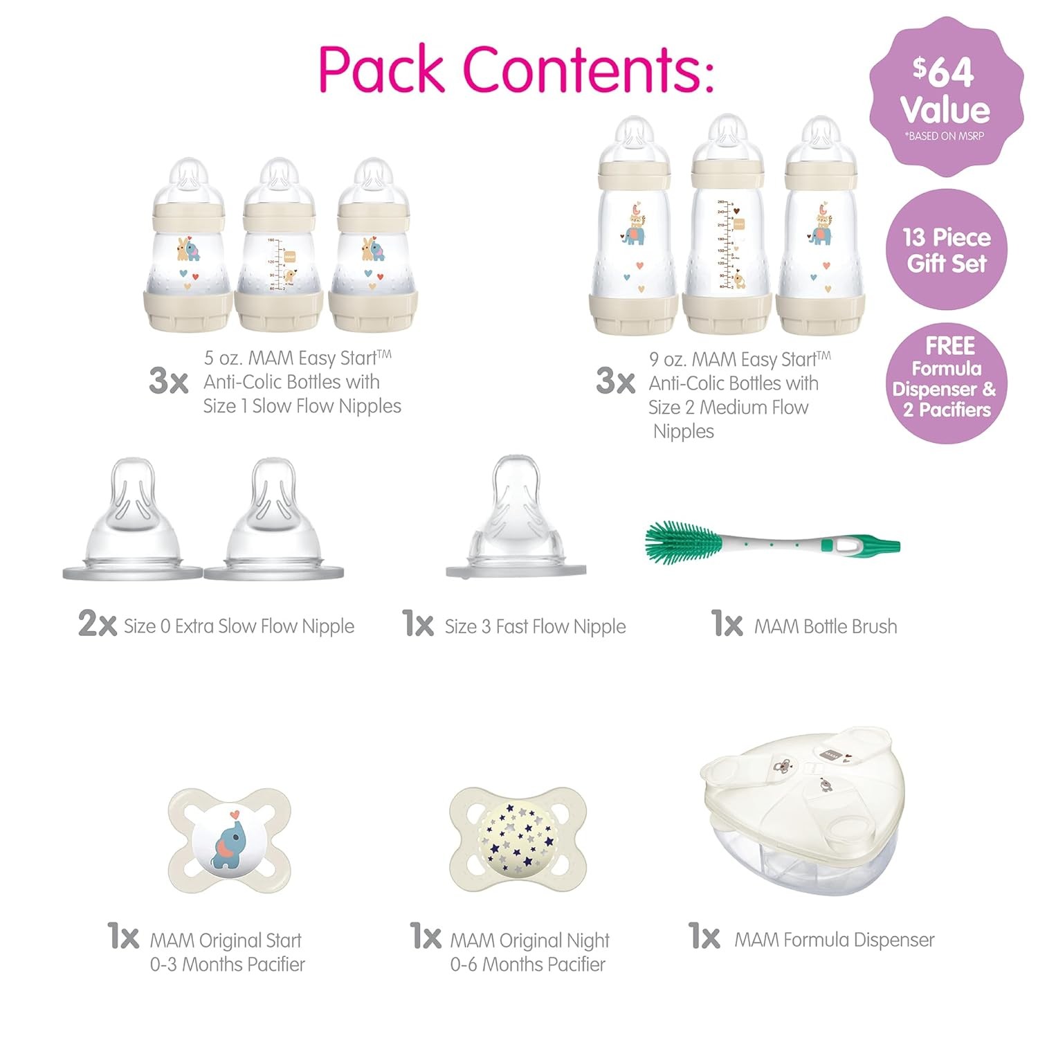 MAM Baby’s First Gift Set, 0+ Months, 5oz and 9oz Anti-Colic Bottles with Self-Sterilization, SkinSoft Silicone Nipples and Pacifiers, Dishwasher Safe Formula Dispenser and Bottle Brush, Unisex