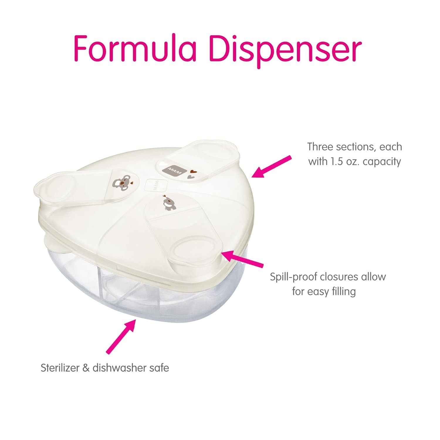 • FORMULA DISPENSER: Sterilizable, dishwasher-safe, BPS/BPA free; stores milk powder, snacks, pacifiers, and teats. 3 spill-free containers with snap covers for easy, hygienic bottle feeding at home or on the go.