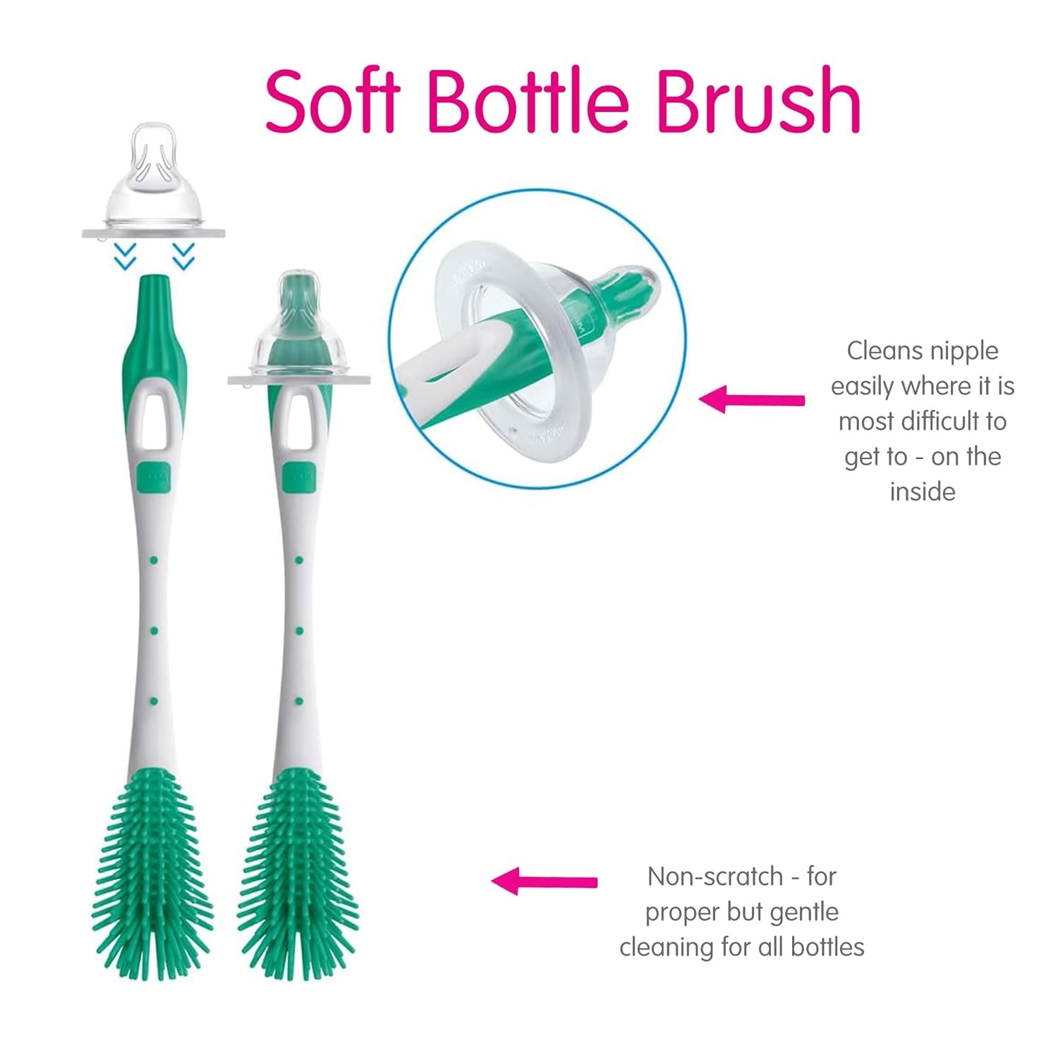 • SOFT BABY BOTTLE BRUSH: Non-scratch, soft bristles ensure gentle cleaning; flexible design adapts to various bottle shapes; ergonomic handle cleans bottle nipples and handles.