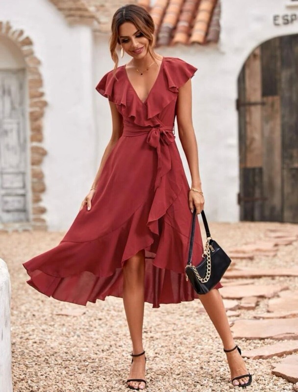 Solid Ruffle Trim Belted Wrap Dress