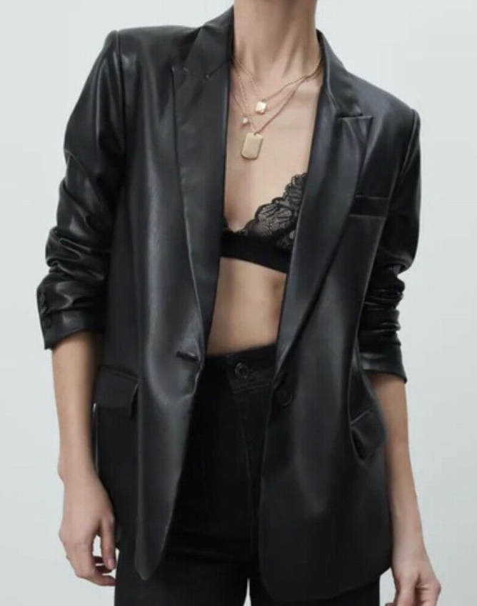 ZARA BLACK PADDED SHOULDER LAPEL COLLAR OVERSIZED MASCULINE FAUX LEATHER BLAZER